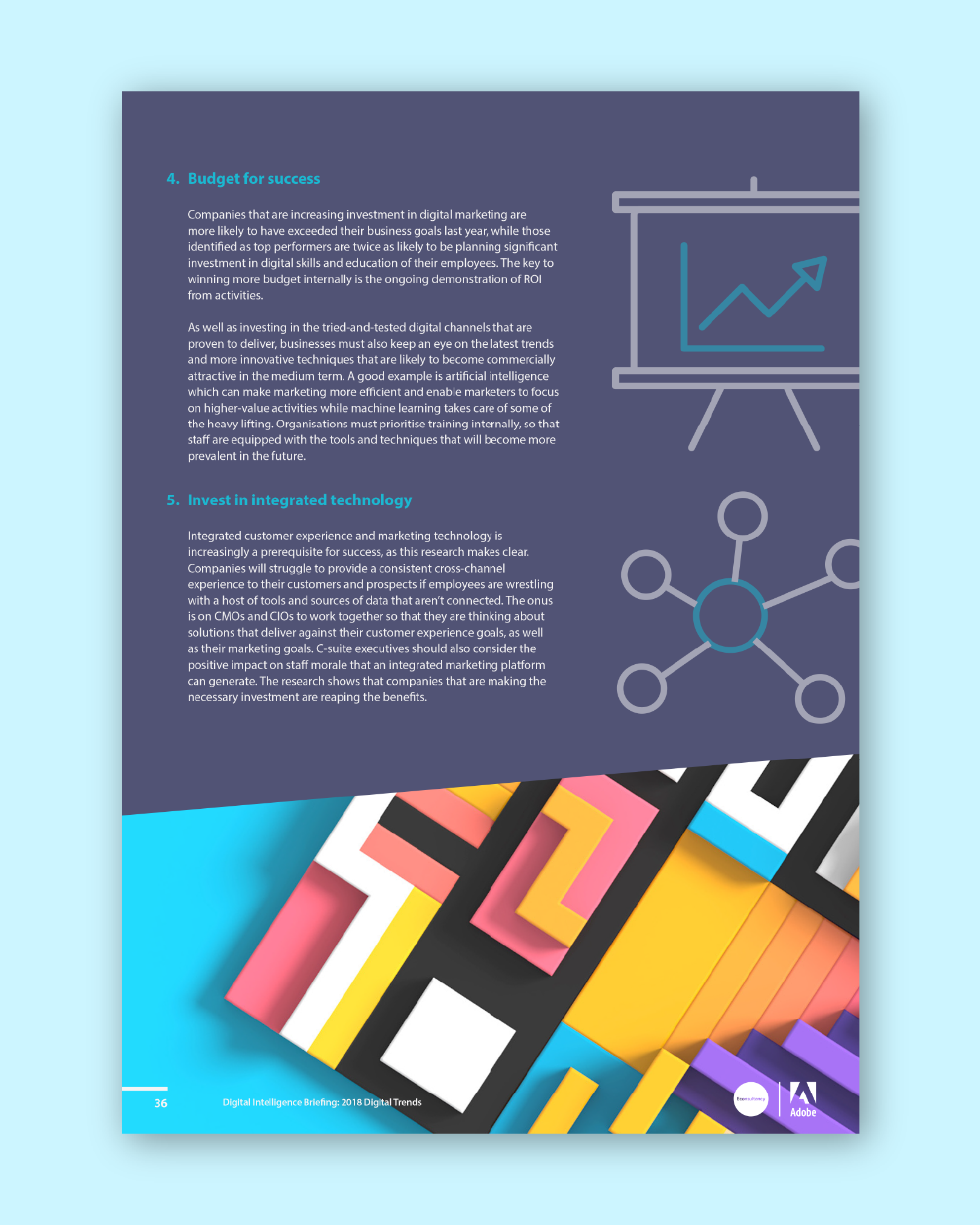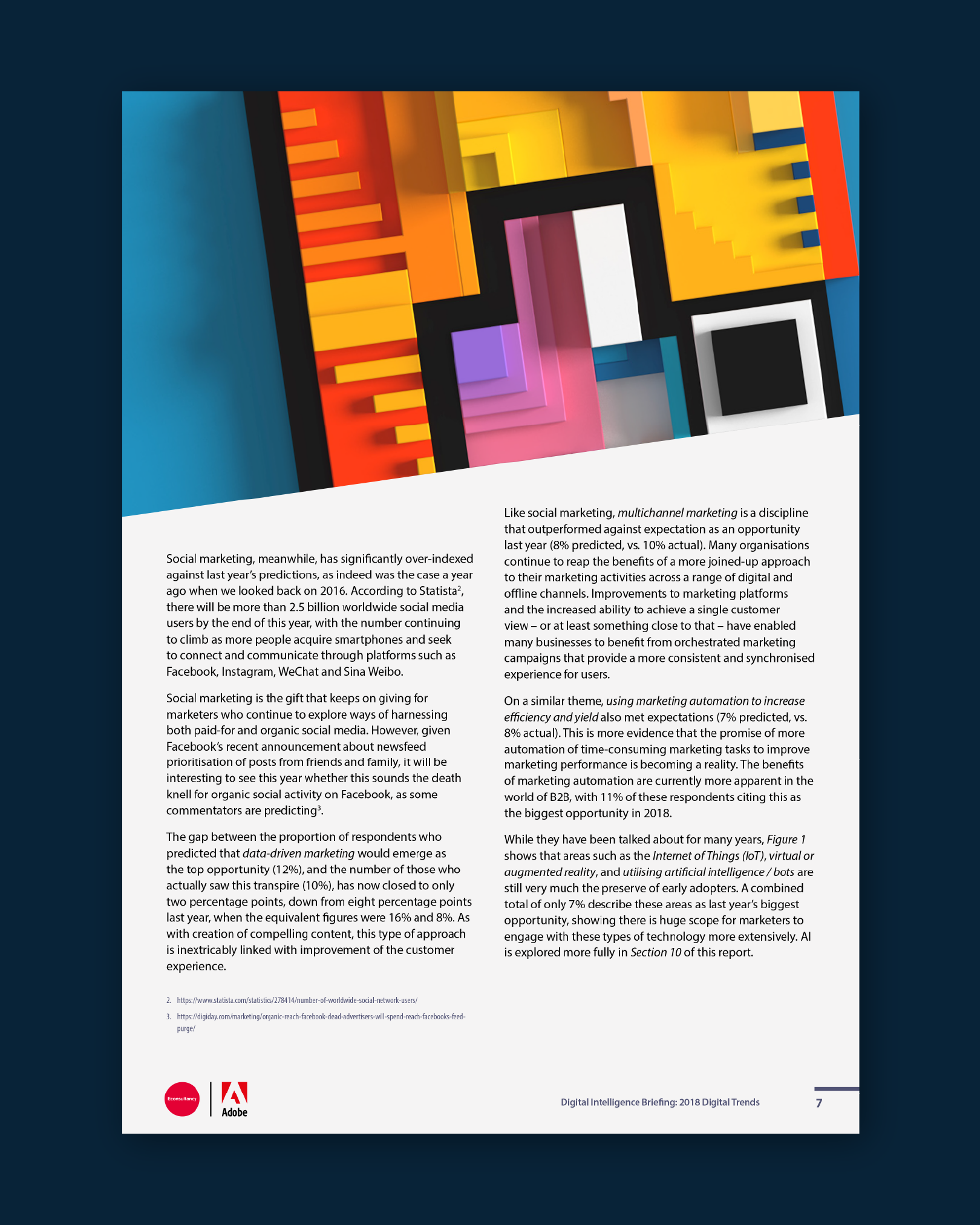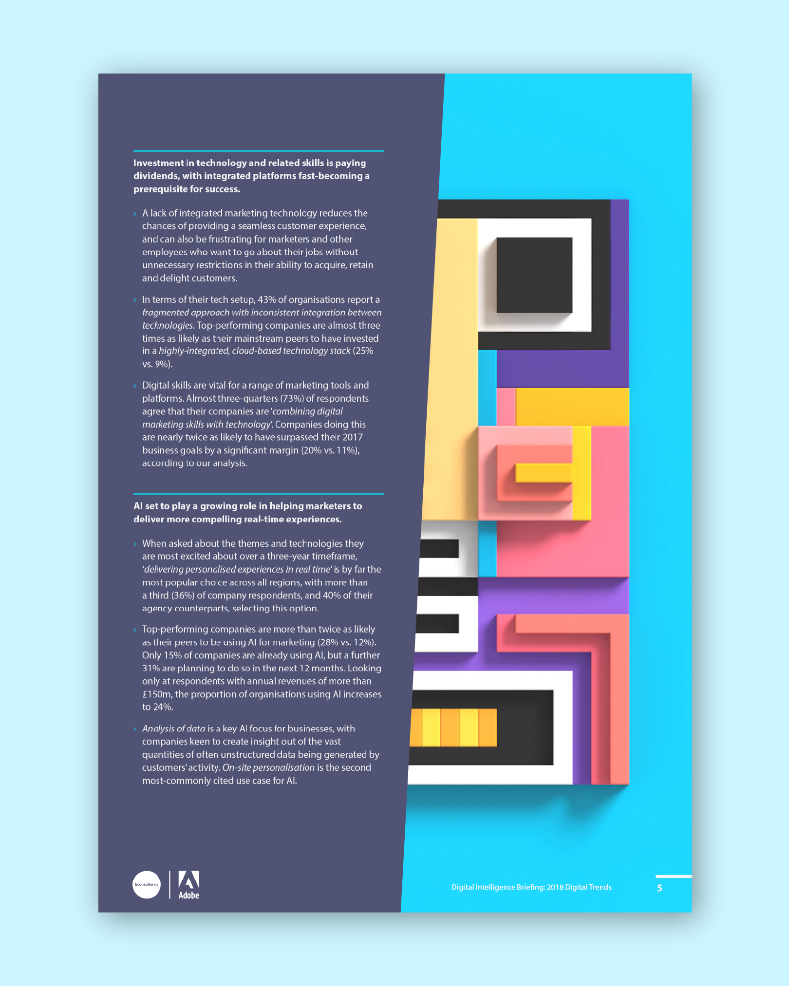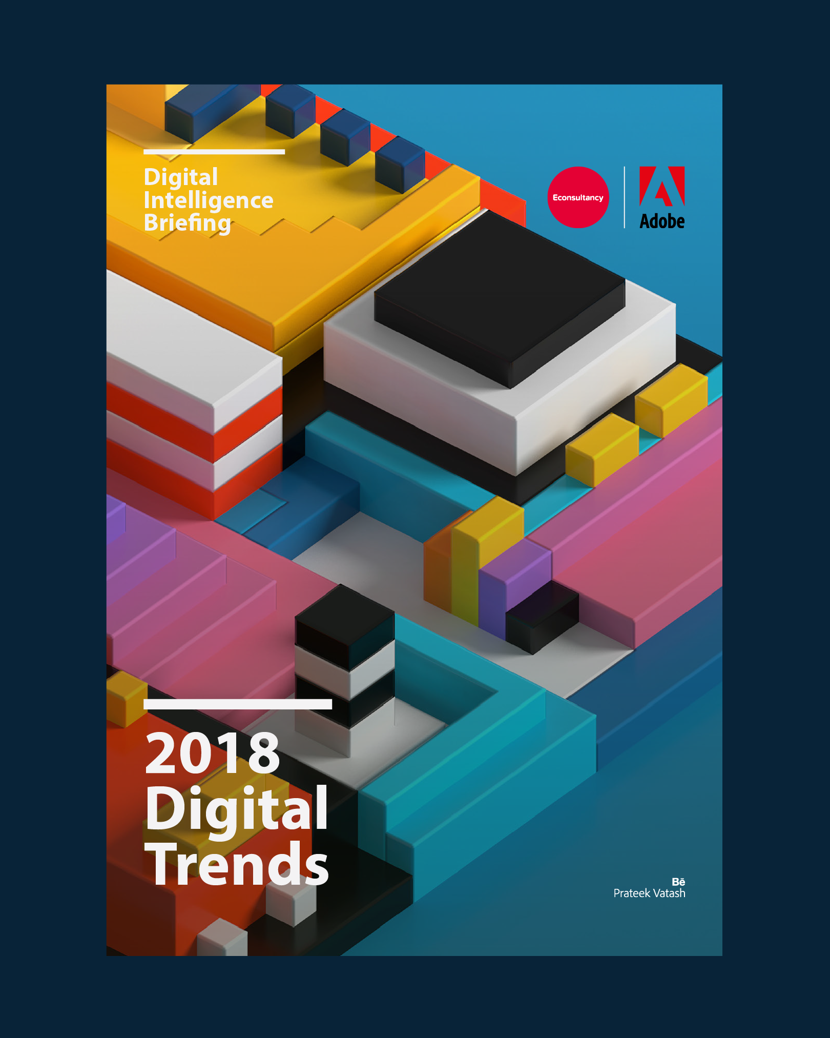 The 2018 Digital Trends report by Adobe and E-consultancy featured several Emotive Pixels artworks across the issue, as the primary visual direction, and used to complement the text and data. Shown here are a few pages from the report where the artworks have been used.