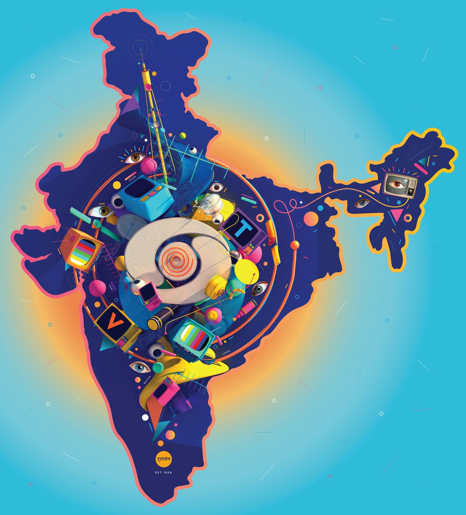 I selected the year 1959, which saw the introduction of Television Broadcast in India, and the establishment of Doordarshan. For this artwork, I am visually interpreting the start of the television boom. The beginning of this ushered in a storm of variety, visuals, and vivacity, which continued to evolve from that day onwards; and has not stopped yet. I could imagine the awe of people – people getting blown away by the technology and the idea of experiencing something from another location at the comfort of their own homes. I wanted to capture the essence of excitement in this artwork.
